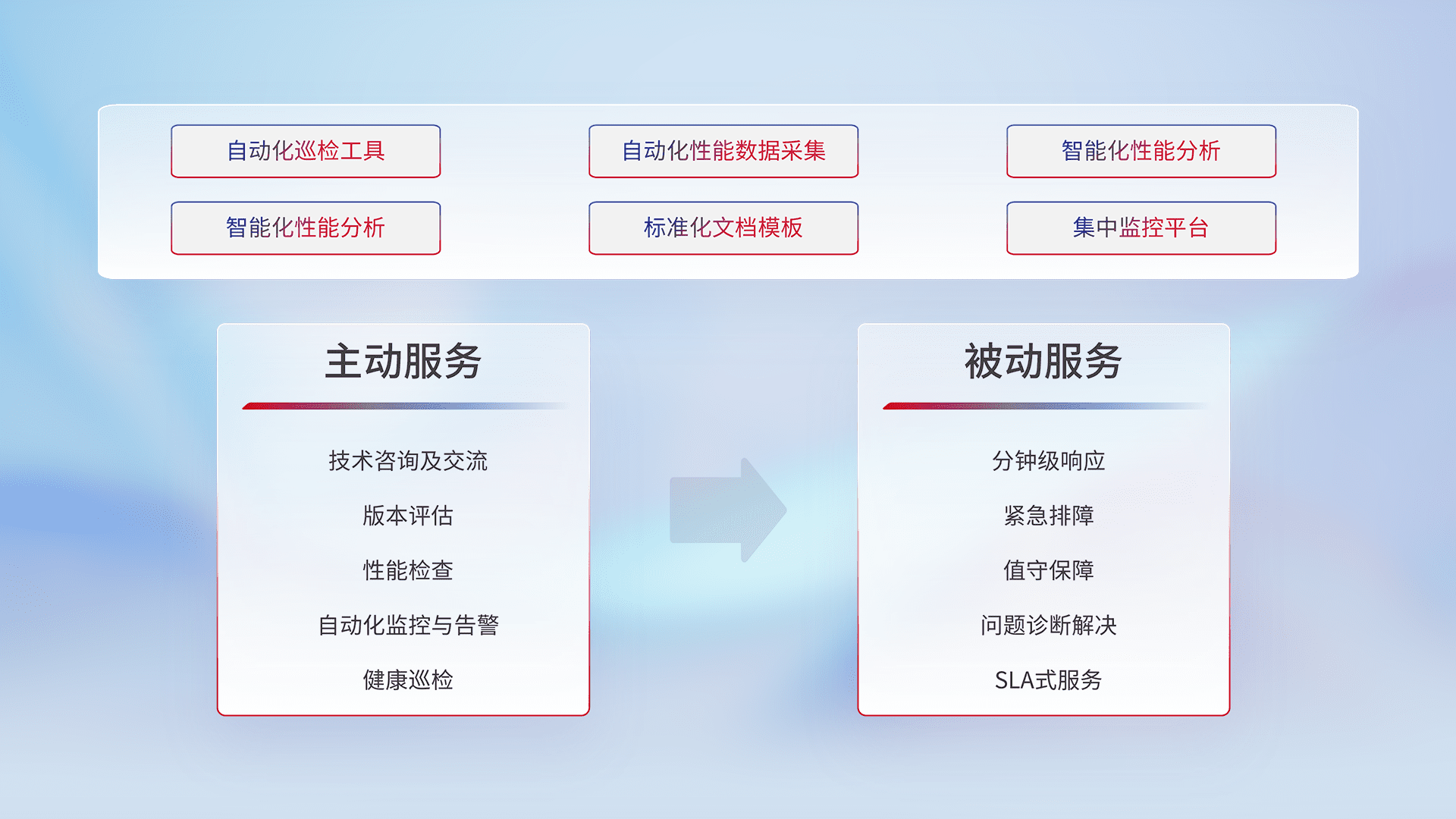 智能化工具和标准化文档,,,,保障服务质量,,,,提供主动服务(包含技术咨询、、版本评估、、、性能检查、、、自动化监控与告警、、、健康巡检)和被动服务包含(分钟级响应、、、紧急排障、、、值守保障、、问题诊断解决、、SLA服务)。。。。